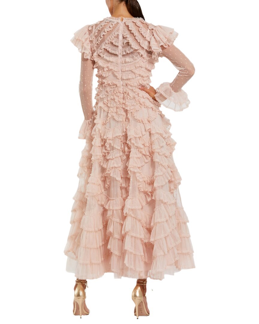 Mac Duggal Dot Net Double Ruffle Trim High Neck Maxi Dress